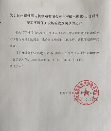 关于台州市伸顺电机制造有限公司年产磁电机50万套项目竣工环境
